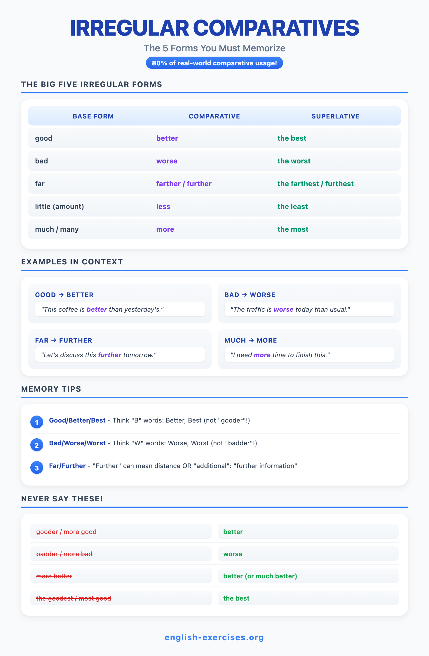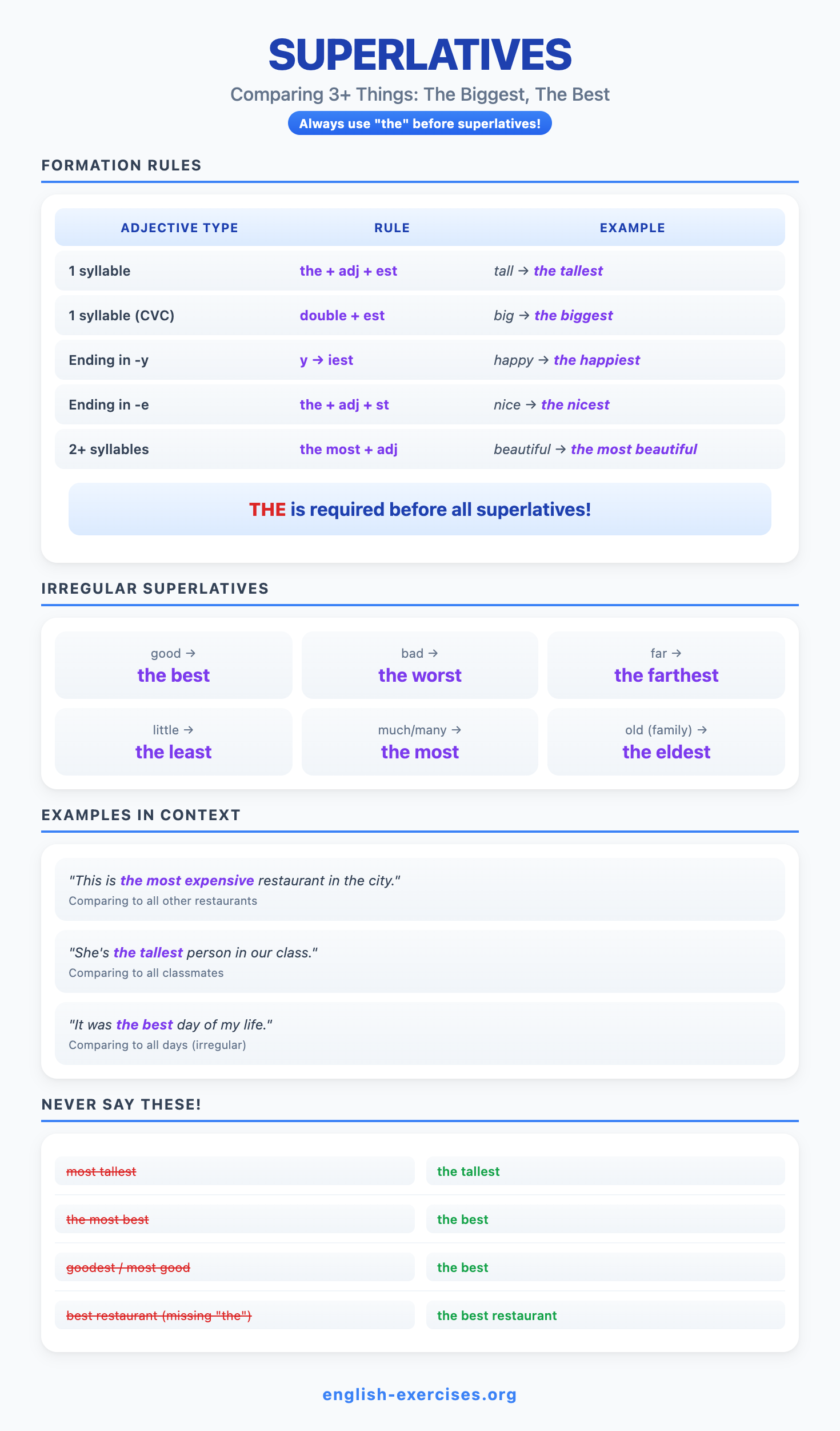 Comparatives and superlatives are forms of adjectives and adverbs used to compare things. Comparatives compare TWO things (taller, more beautiful), while superlatives compare THREE or more things within a group (the tallest, the most beautiful). According to corpus research, comparatives appear in approximately 2.3% of all English sentences, making them one of the most frequent grammatical structures learners encounter.