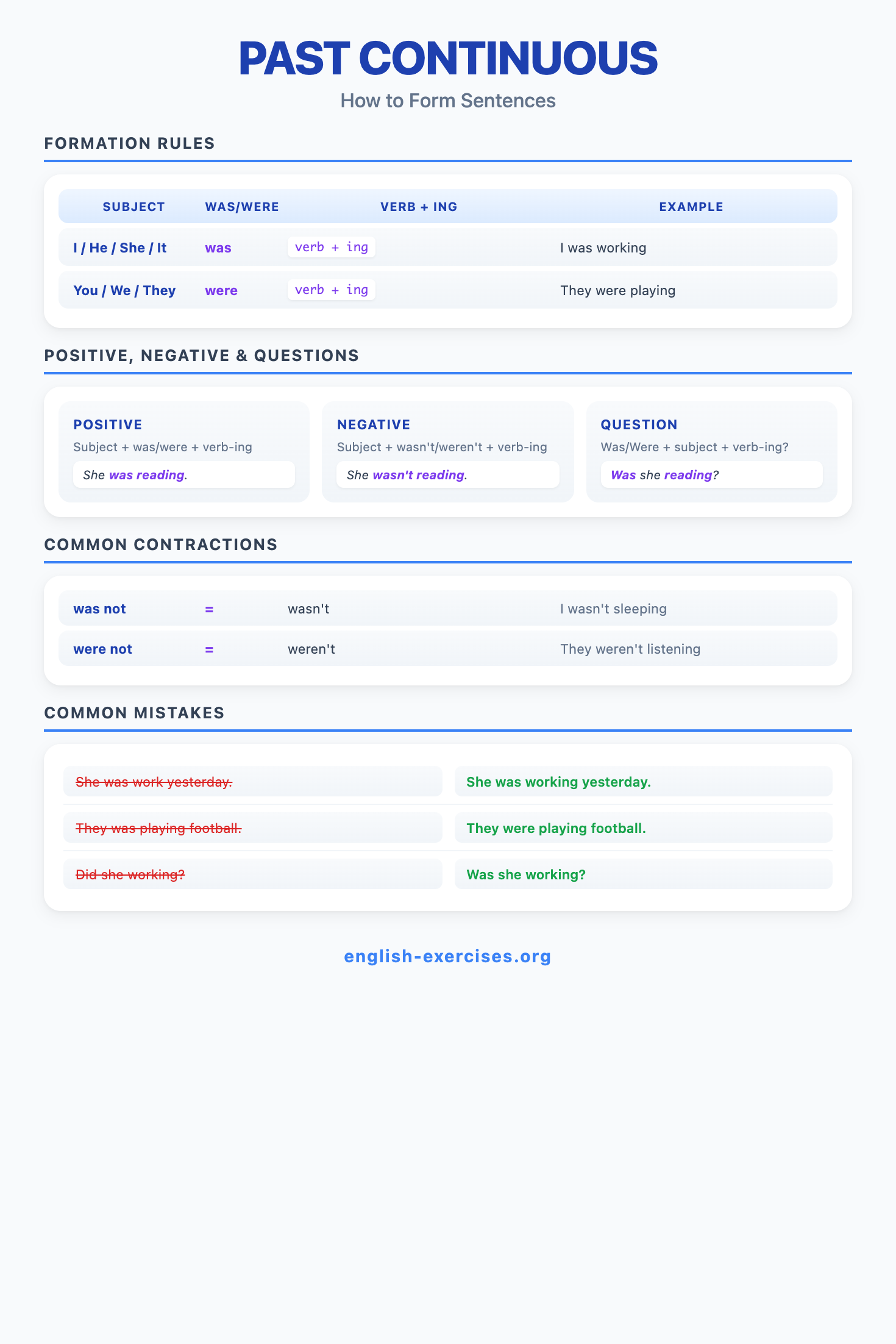 The past continuous (also called past progressive) is formed with was/were + verb-ing. It describes actions that were in progress at a specific time in the past. Corpus research shows past continuous accounts for approximately 3-4% of all verb forms in English, making it essential for storytelling, describing interrupted actions, and setting narrative scenes.