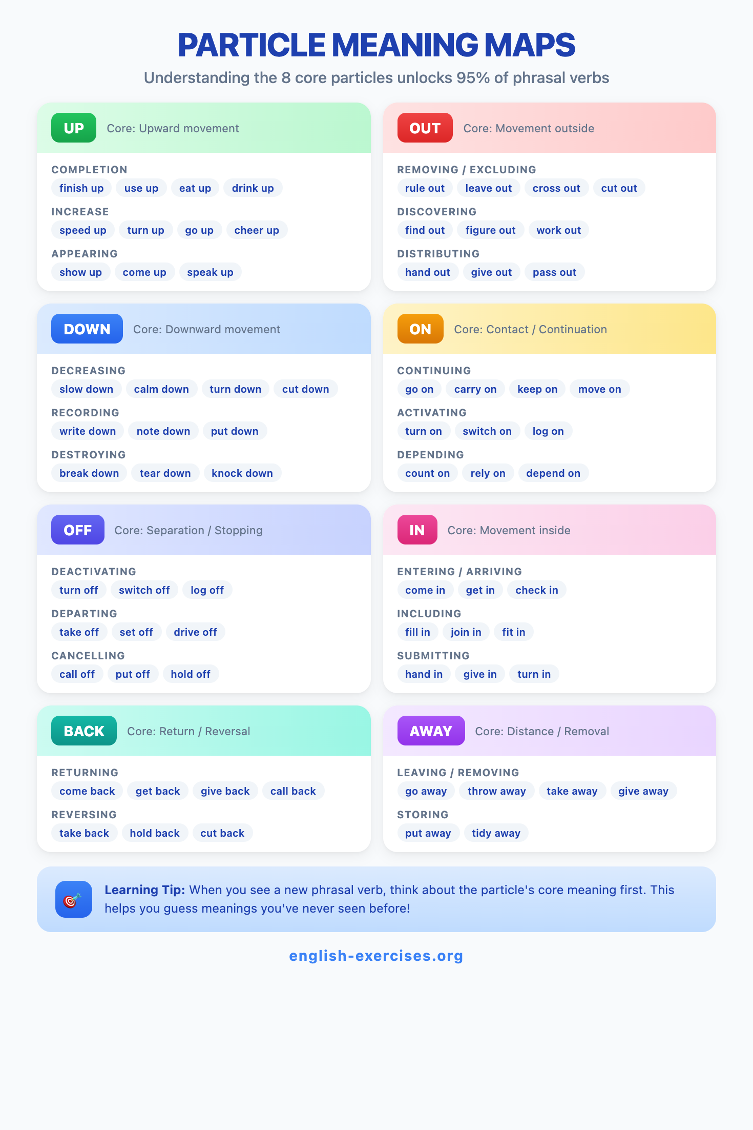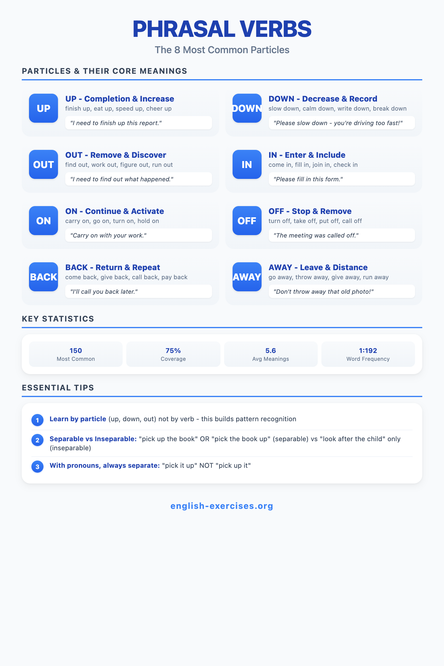 Phrasal verbs are combinations of a verb + particle (preposition or adverb) that create a completely new meaning. For example, "give up" means to stop trying - a meaning you cannot guess from "give" alone. Research shows that the top 150 phrasal verbs (the PHaVE List) cover 83% of all phrasal verb usage in everyday English.