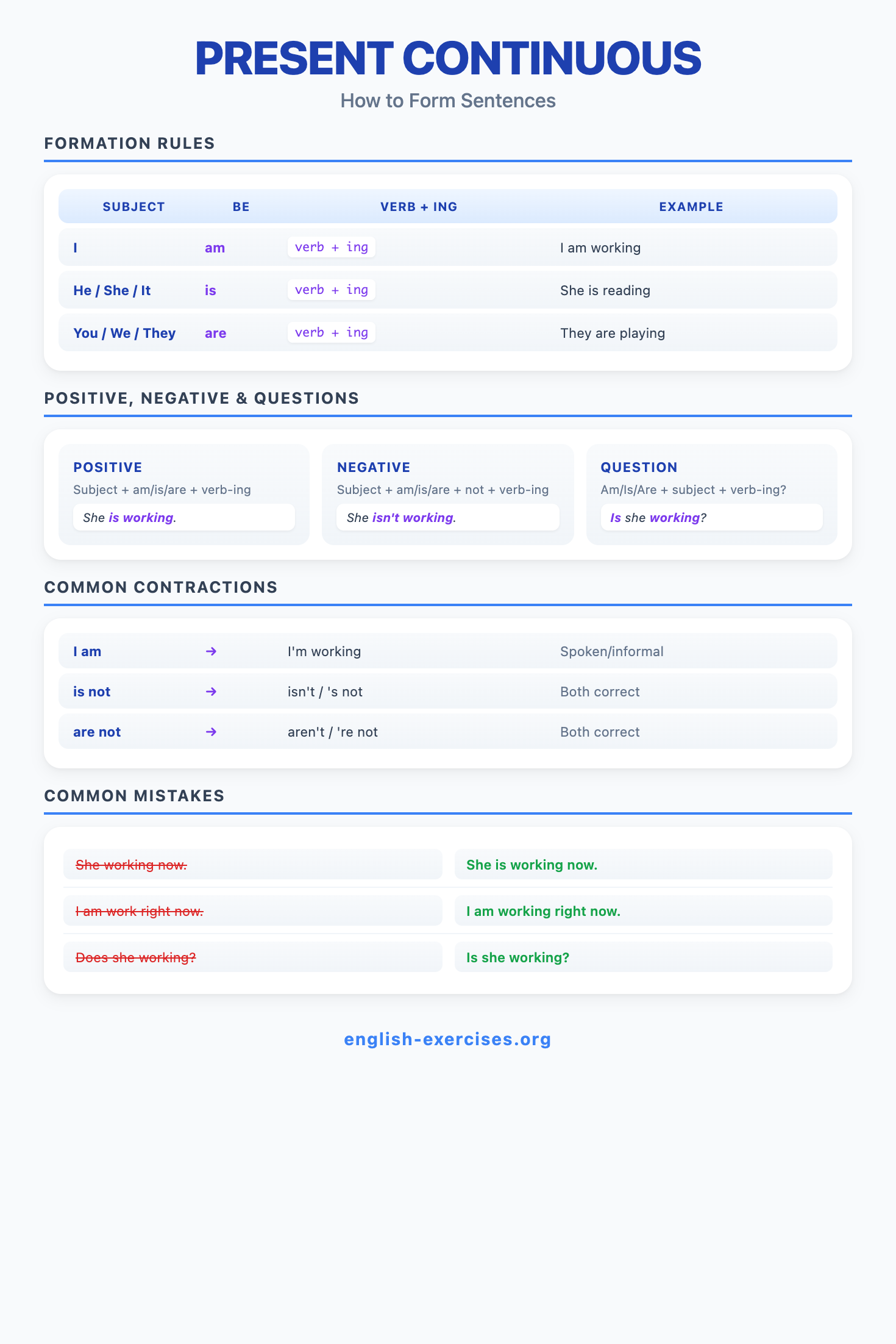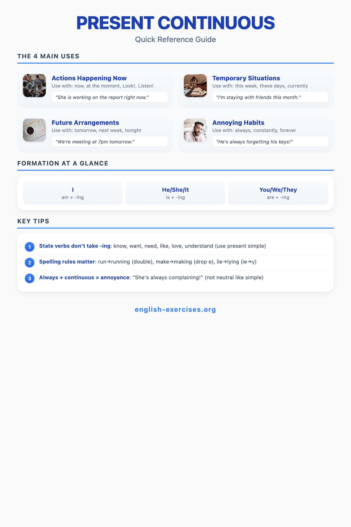 The present continuous (also called present progressive) is formed with am/is/are + verb-ing. It describes actions happening right now, temporary situations, future arrangements, and annoying habits. Corpus research shows it accounts for about 15% of all verb forms in spoken English, making it one of the three most frequently used tenses.