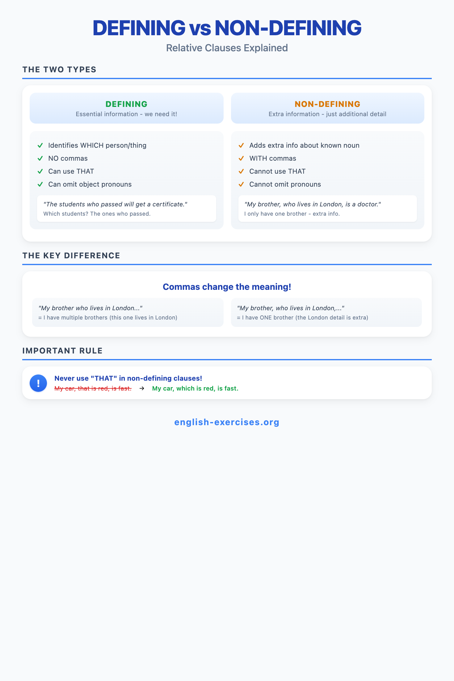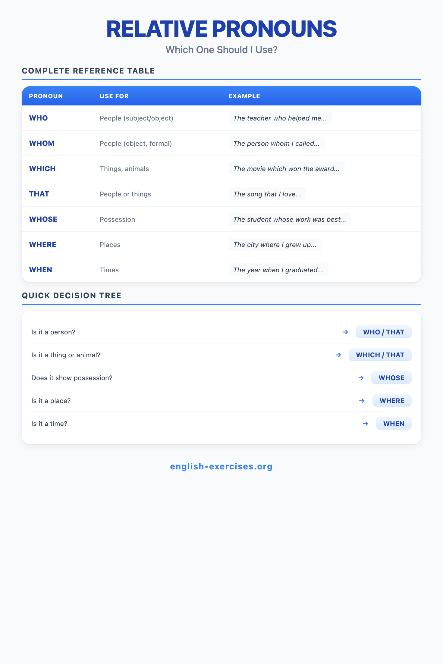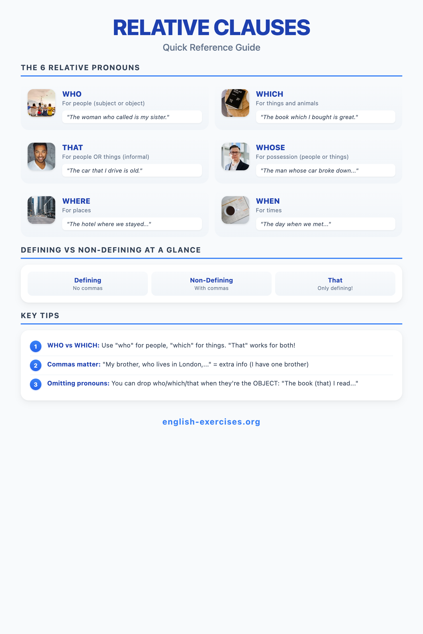 Relative clauses are dependent clauses that give more information about a noun in the main sentence. They begin with relative pronouns (who, which, that, whose, whom) or relative adverbs (where, when, why). Corpus research shows relative clauses appear in approximately 15% of all English sentences, making them essential for fluent communication.