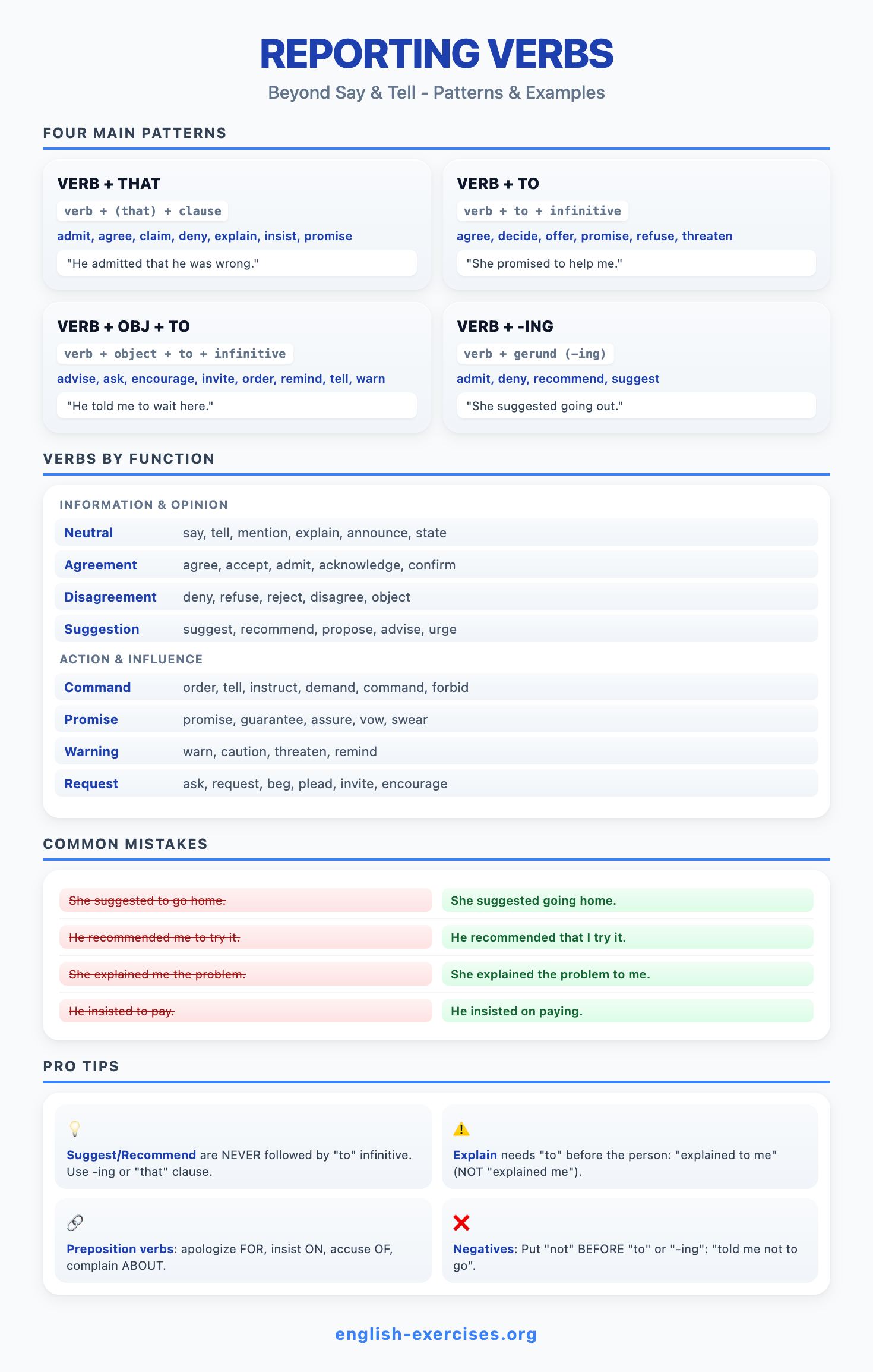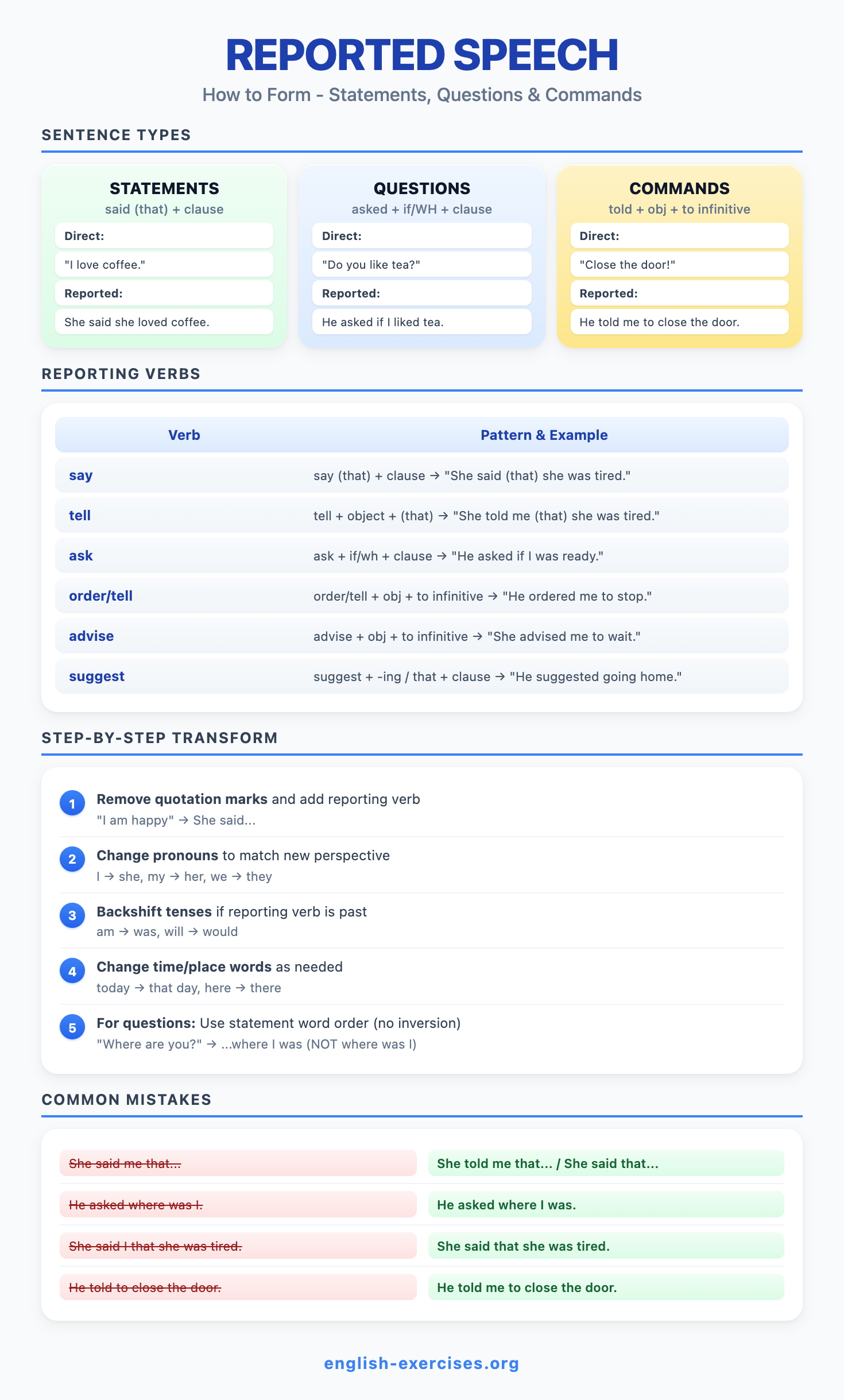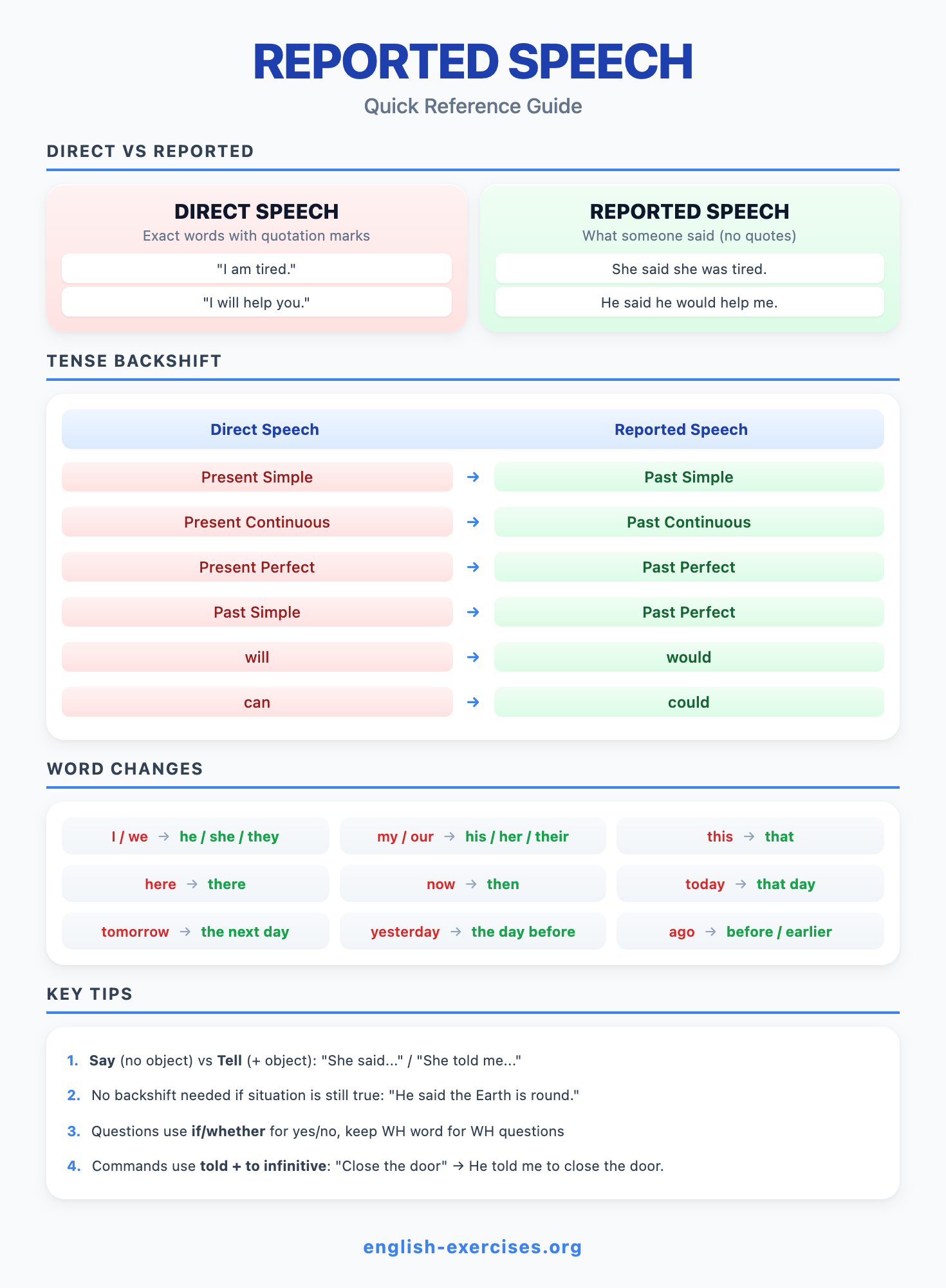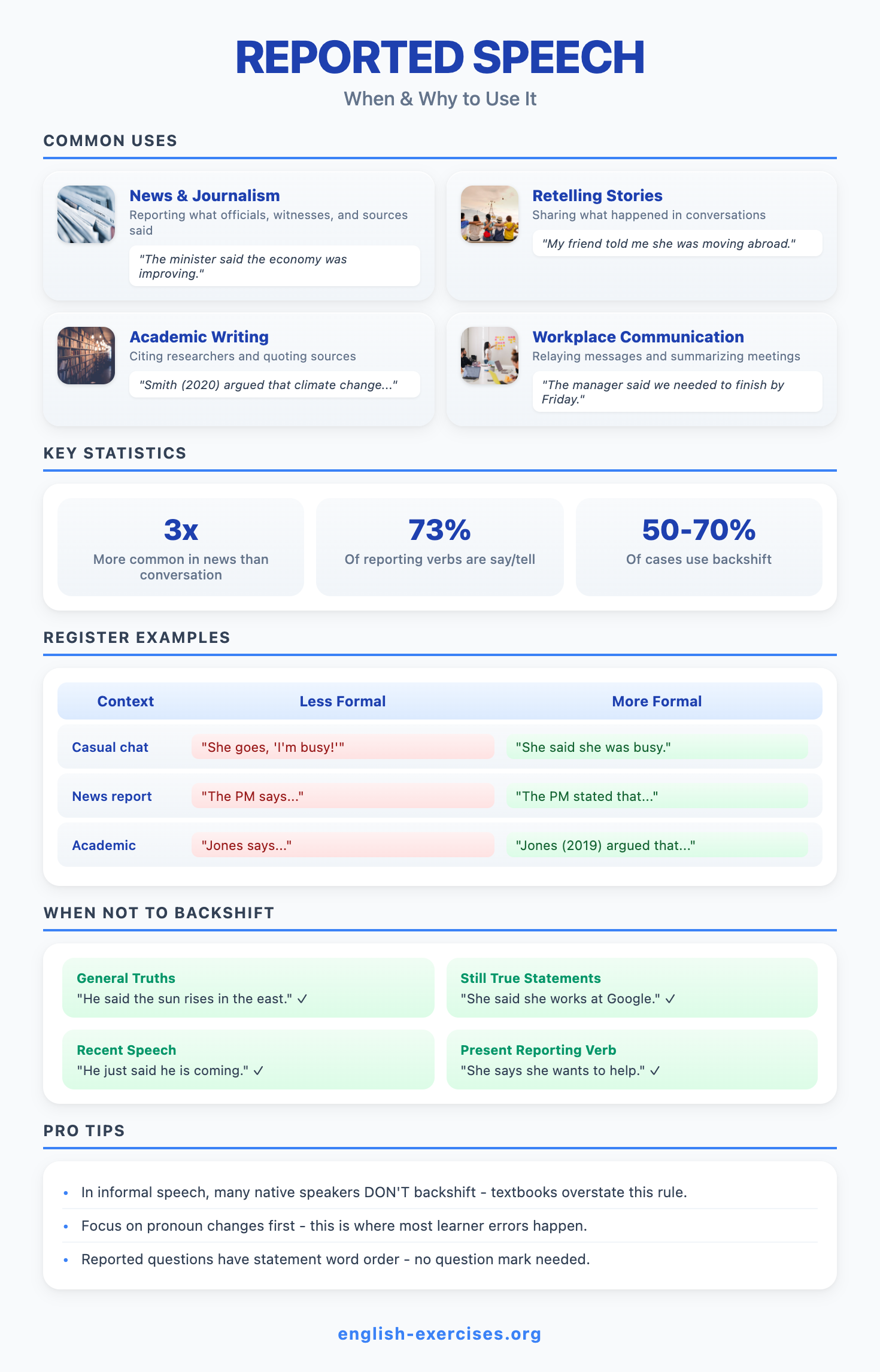 Reported speech (also called indirect speech) tells what someone said without using their exact words. Instead of quoting directly with quotation marks, you report the message in your own words. For example: Direct: "I am tired." Reported: She said she was tired. Corpus research shows reported speech occurs three times more often in news writing than in everyday conversation.