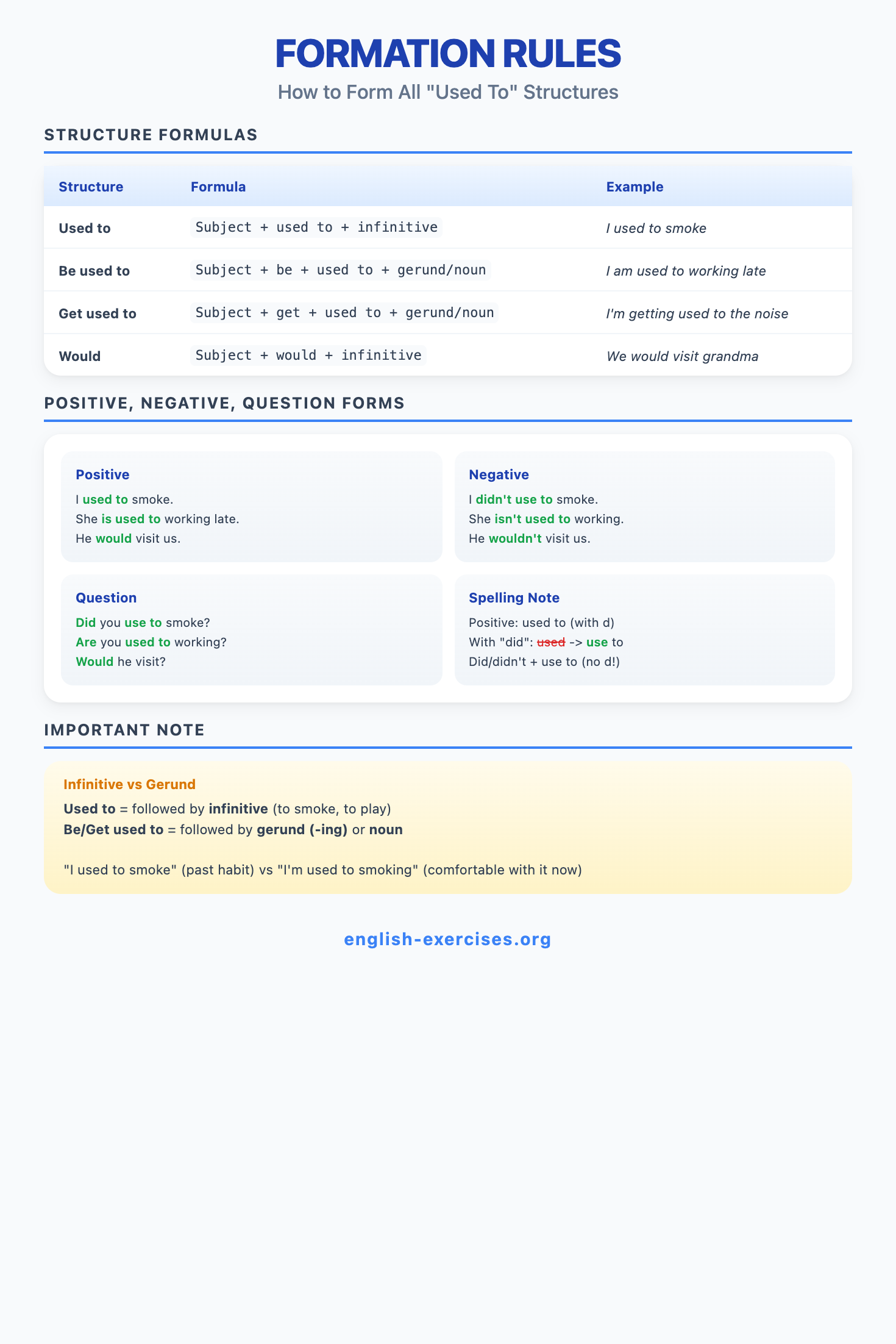 "Used to" and "be used to" are two completely different structures with different meanings and time references. According to the British National Corpus, "used to" for past habits appears approximately 85 times per million words, making it one of the most common ways to express past habits in English. The key difference is that "used to + infinitive" describes past habits that no longer exist, while "be used to + gerund" describes present familiarity or comfort with something.