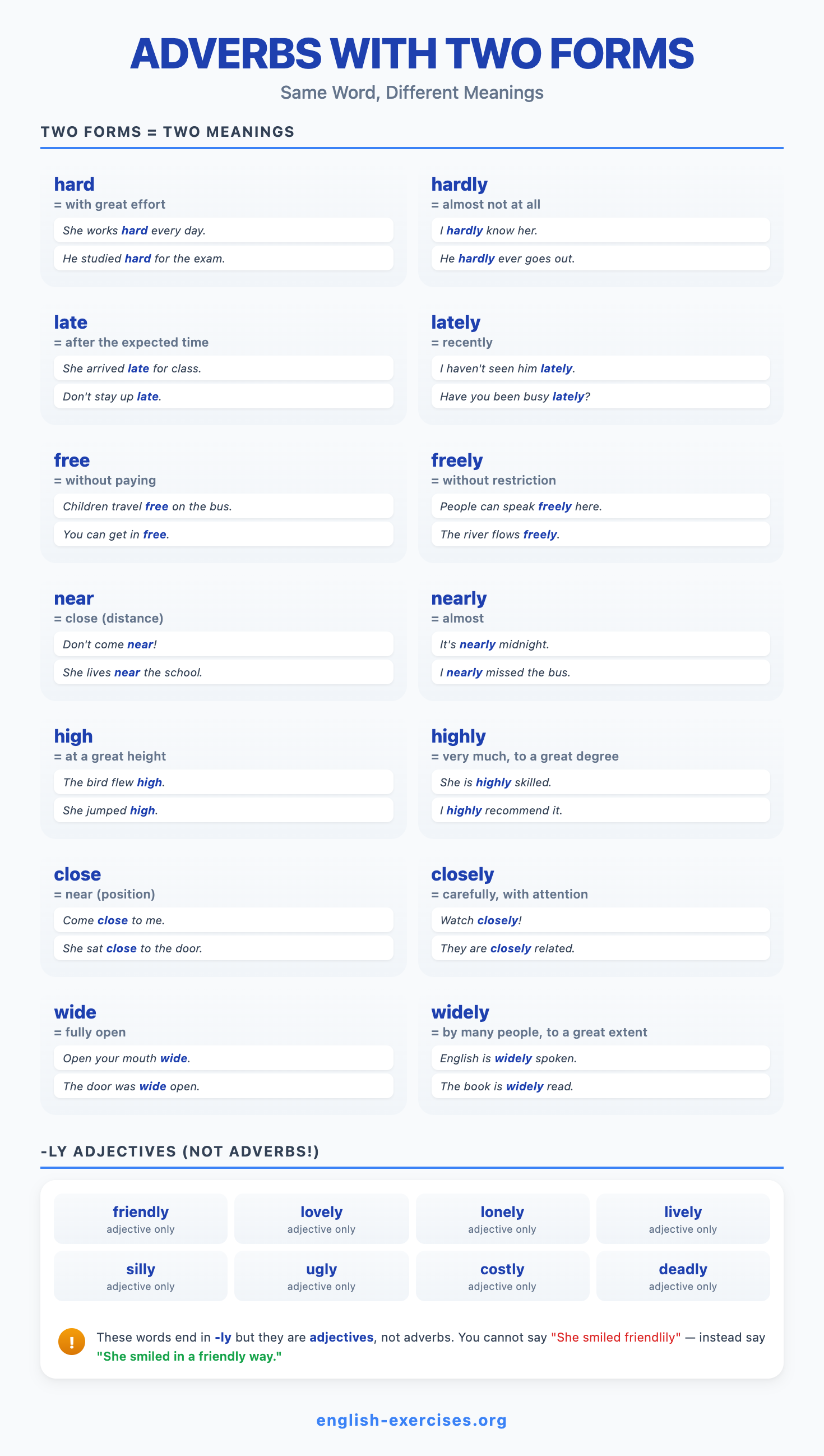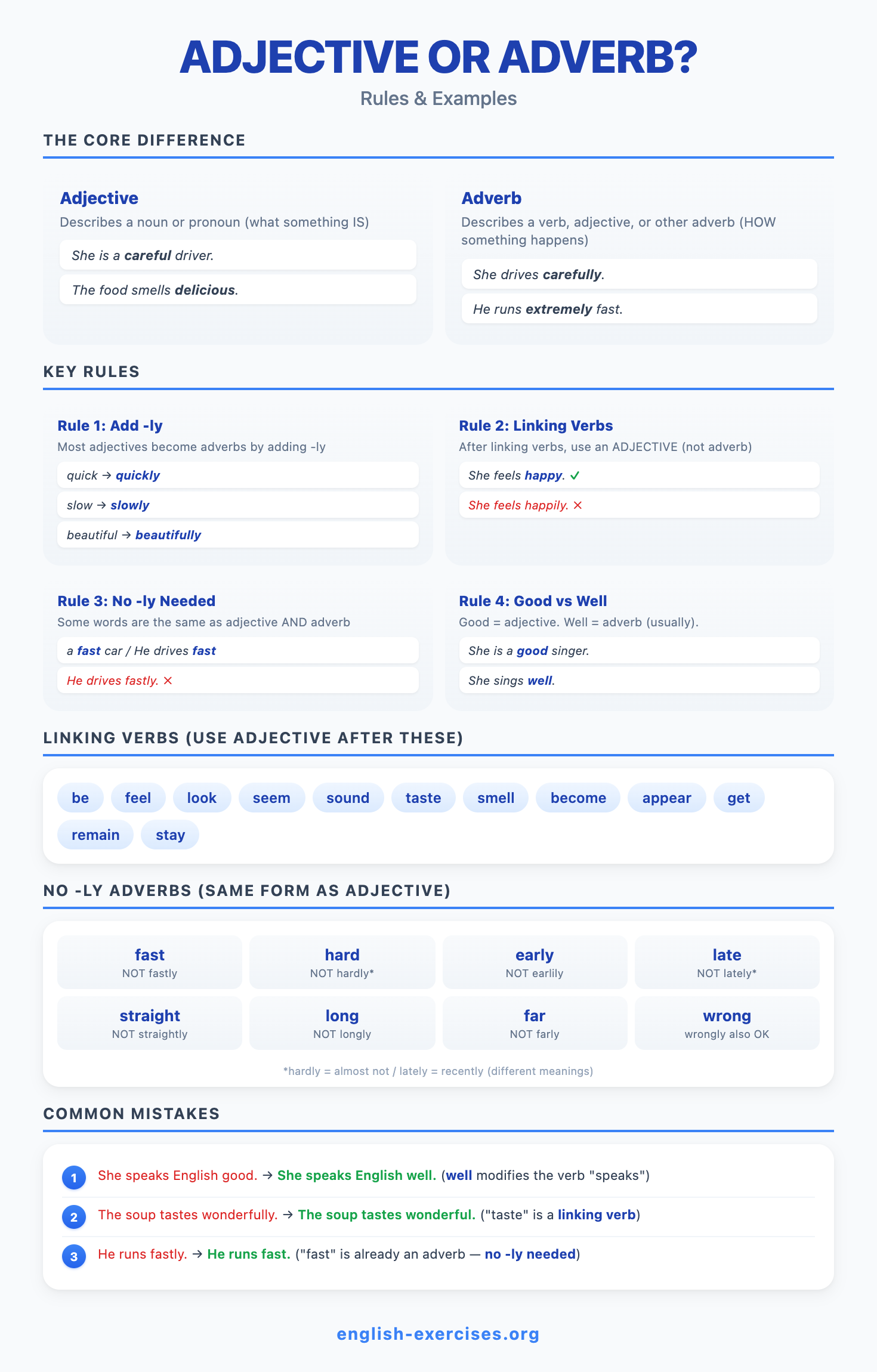Adjectives describe nouns — they tell us about a person, place, or thing. Adverbs describe verbs, adjectives, or other adverbs — they tell us how, when, where, or to what degree something happens. This is the most fundamental distinction in English grammar, and confusing the two is one of the most common mistakes learners make.