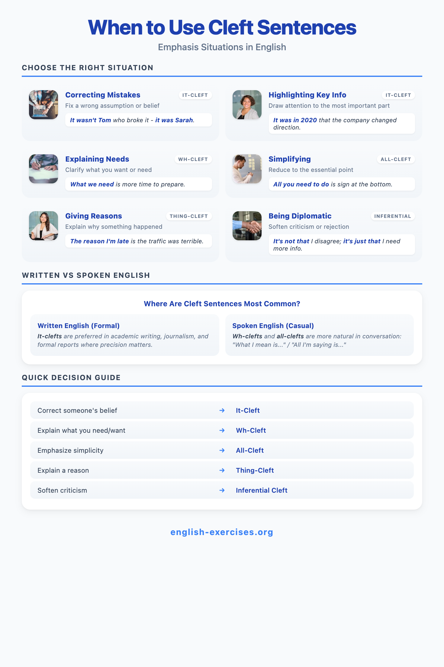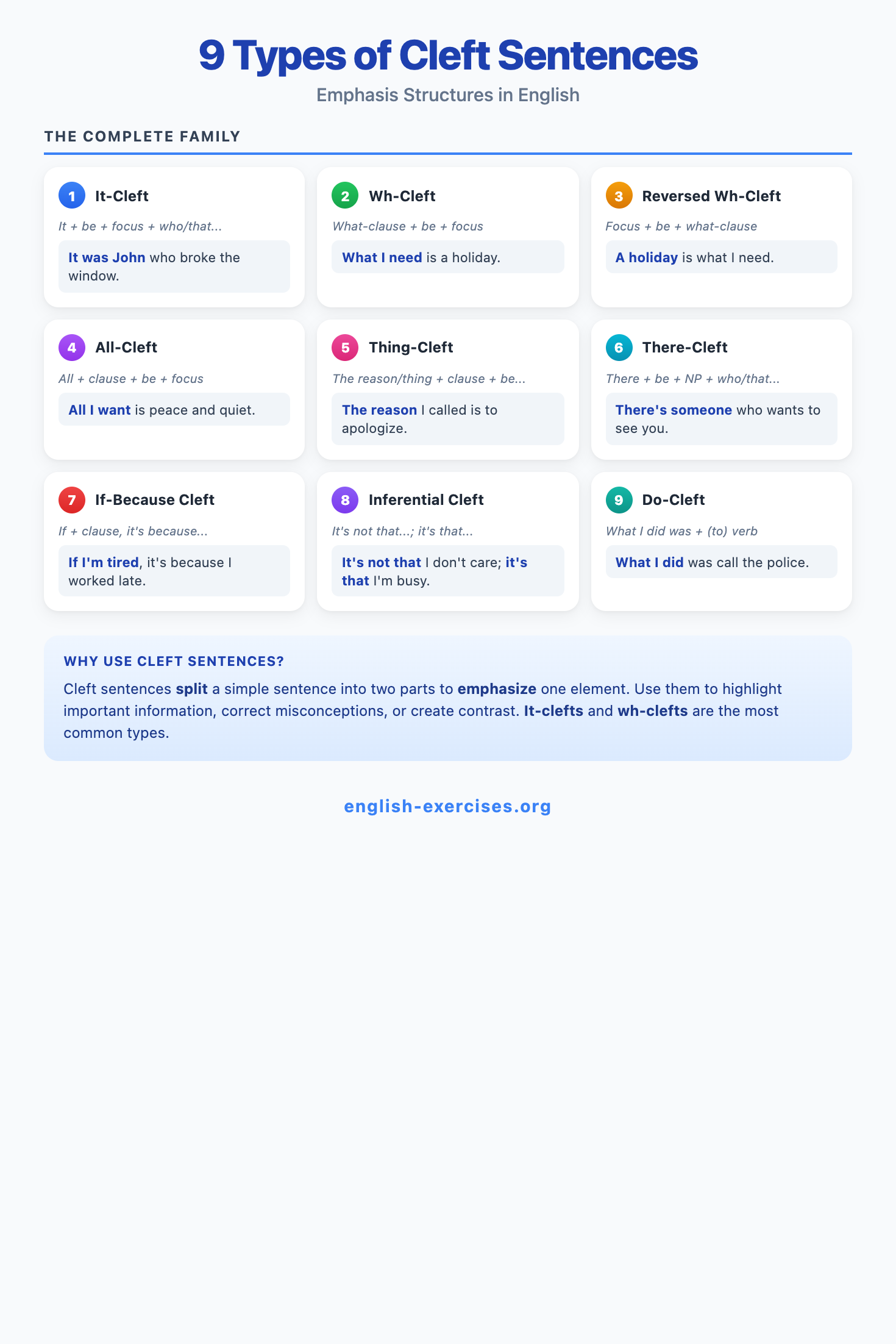 Master all 9 cleft sentence types with 14 progressive exercises and 280 practice questions