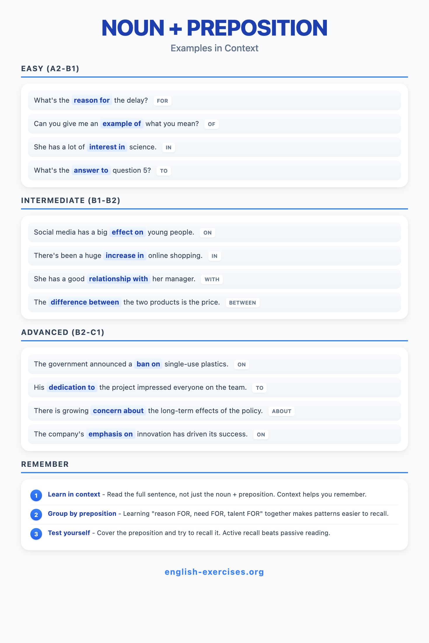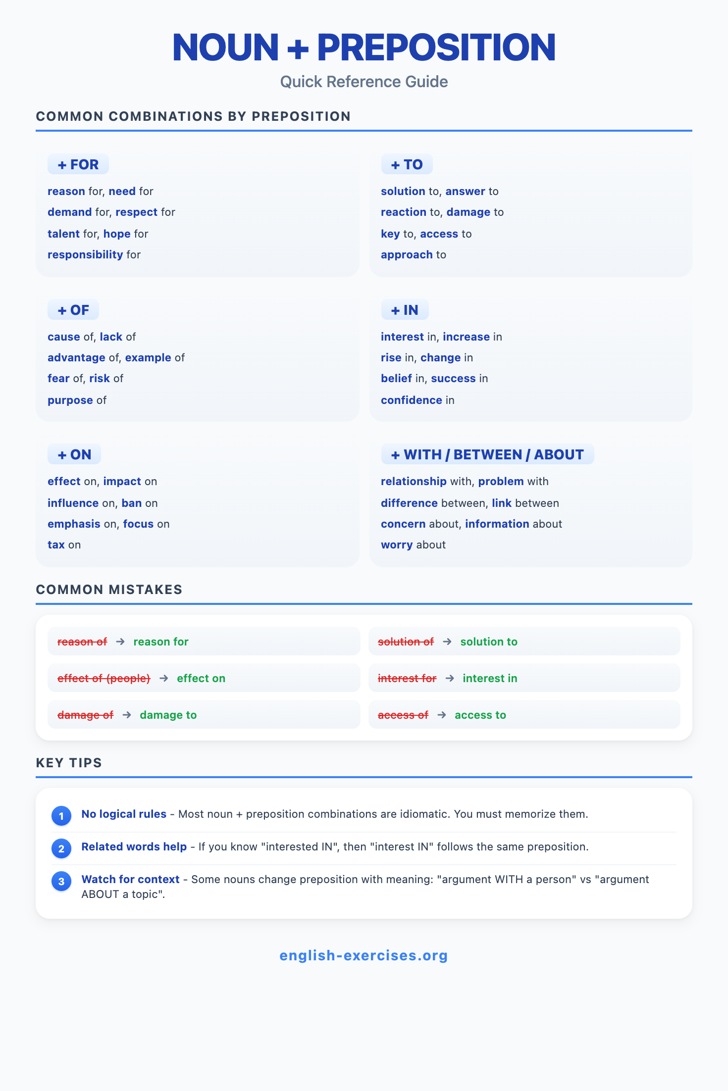 Noun + preposition combinations are fixed collocations where certain nouns always take a specific preposition. Unlike in some languages, the preposition is not predictable - you must memorize these patterns. For example: "reason FOR" (not 'of'), "interest IN" (not 'on'), "effect ON" (not 'in').