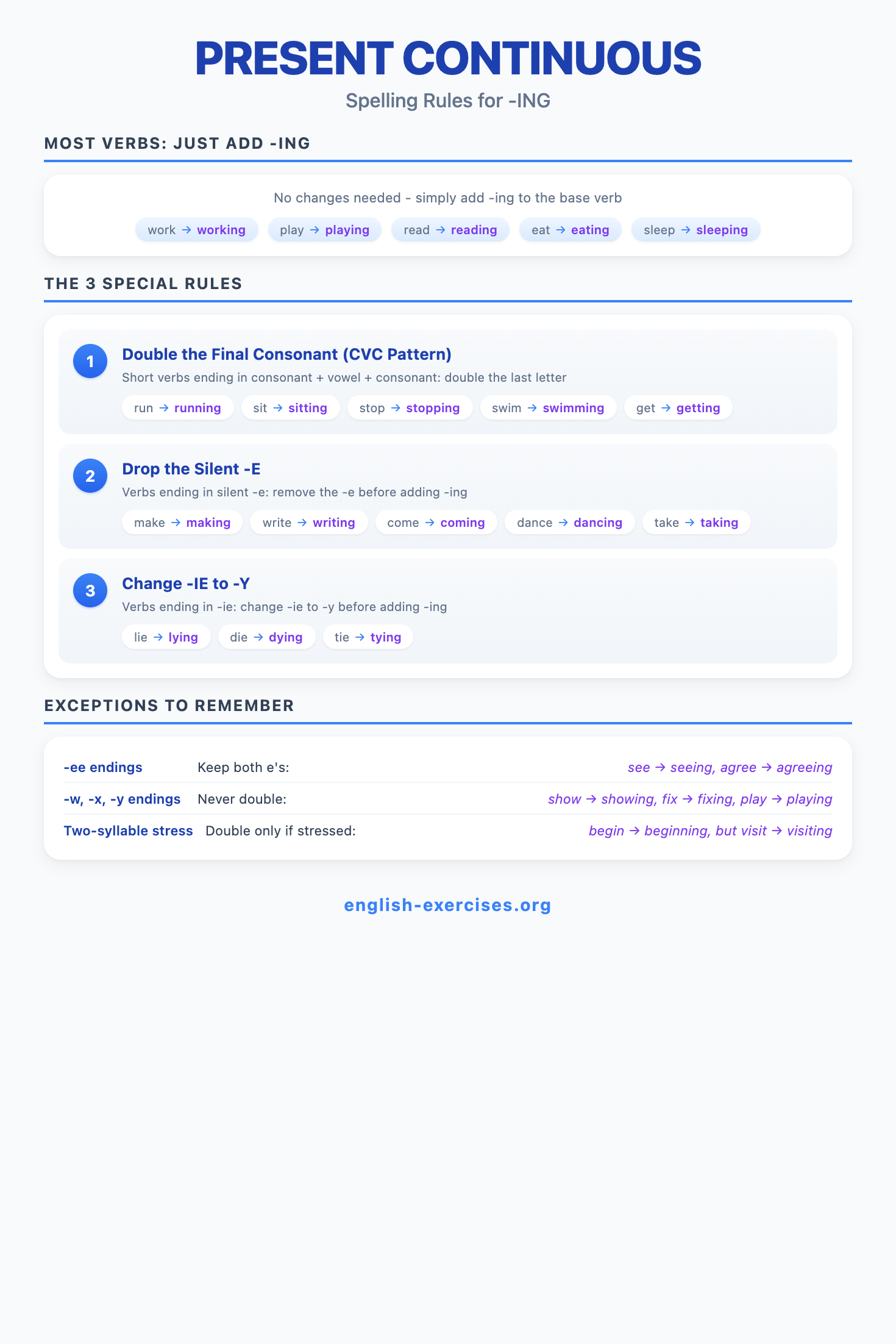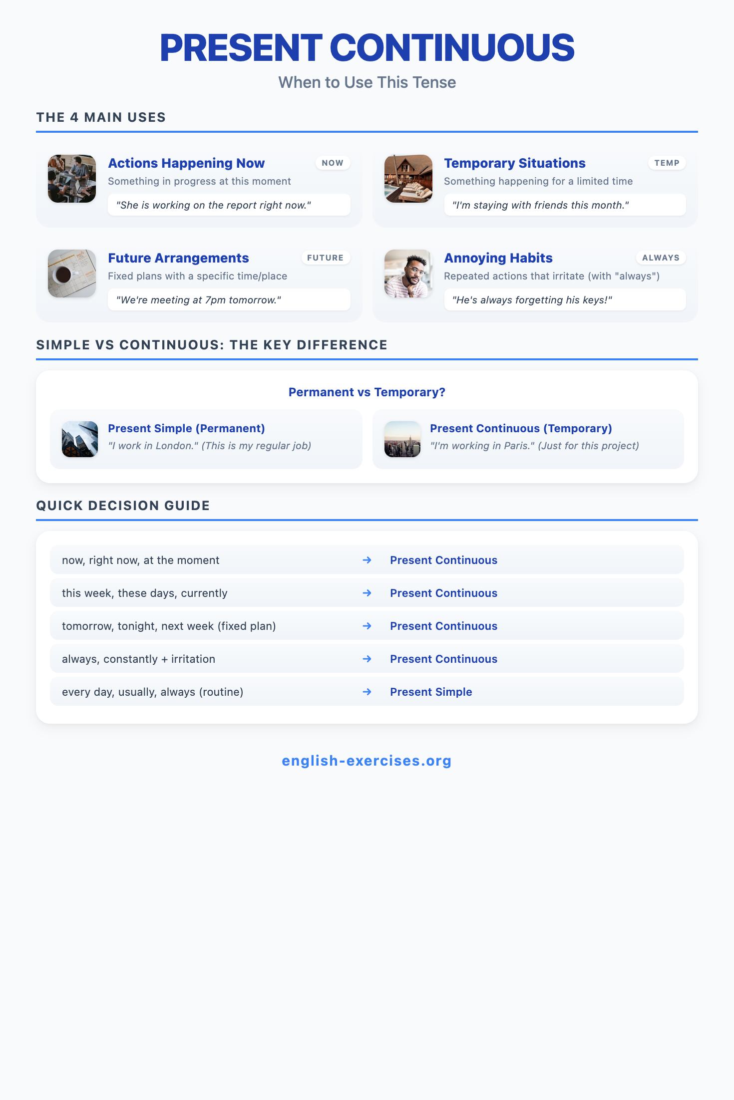 The present continuous (also called present progressive) is formed with am/is/are + verb-ing. It describes actions happening right now, temporary situations, future arrangements, and annoying habits. Corpus research shows it accounts for about 15% of all verb forms in spoken English, making it one of the three most frequently used tenses.