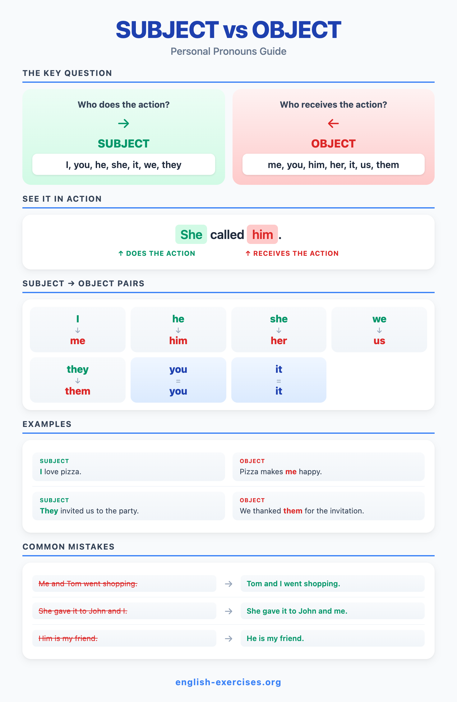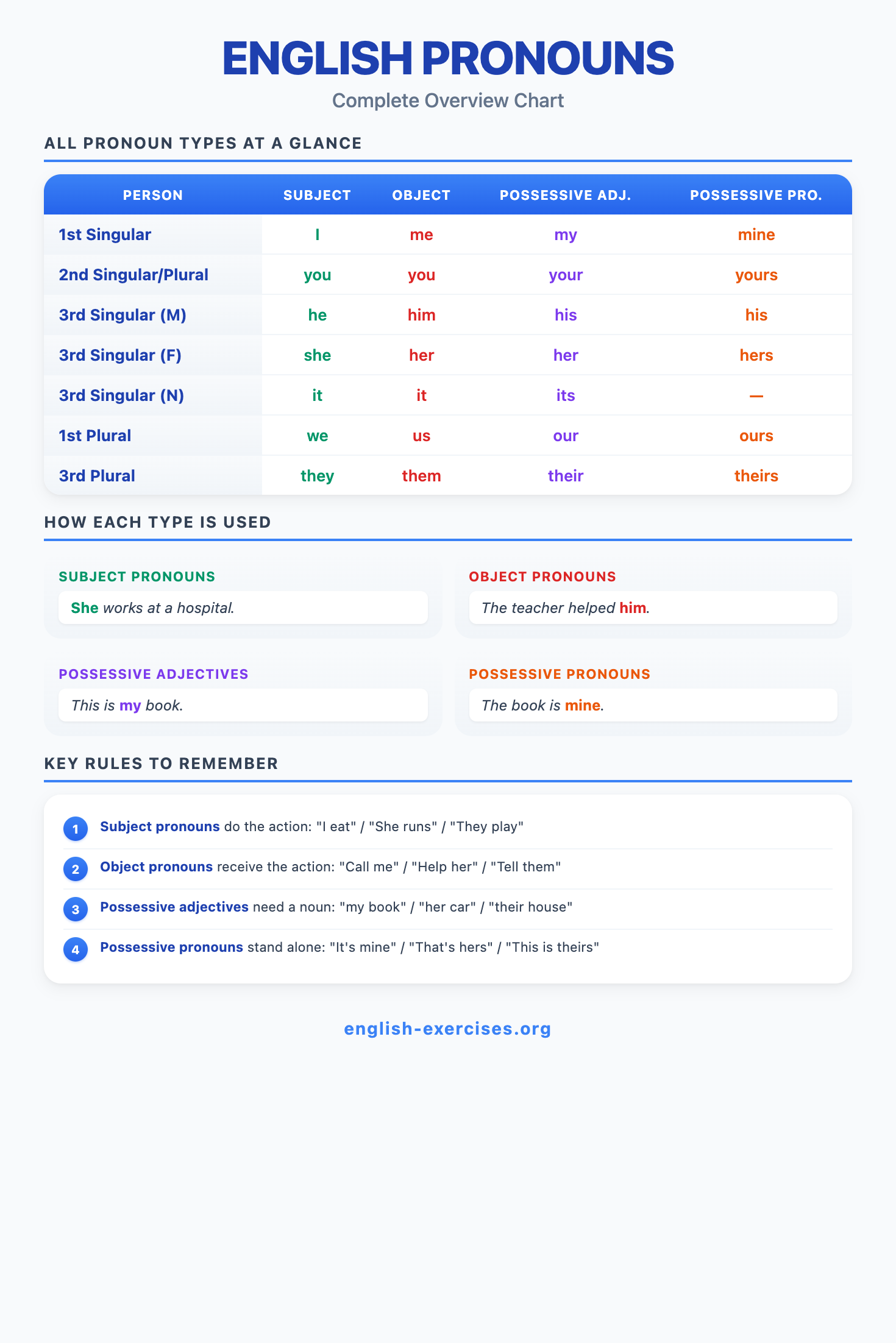 Personal pronouns replace nouns to avoid repetition. English has four main types: subject pronouns (I, you, he, she, it, we, they), object pronouns (me, you, him, her, it, us, them), possessive adjectives (my, your, his, her, its, our, their), and possessive pronouns (mine, yours, his, hers, ours, theirs). Corpus research shows pronouns make up about 15% of all words in spoken English.