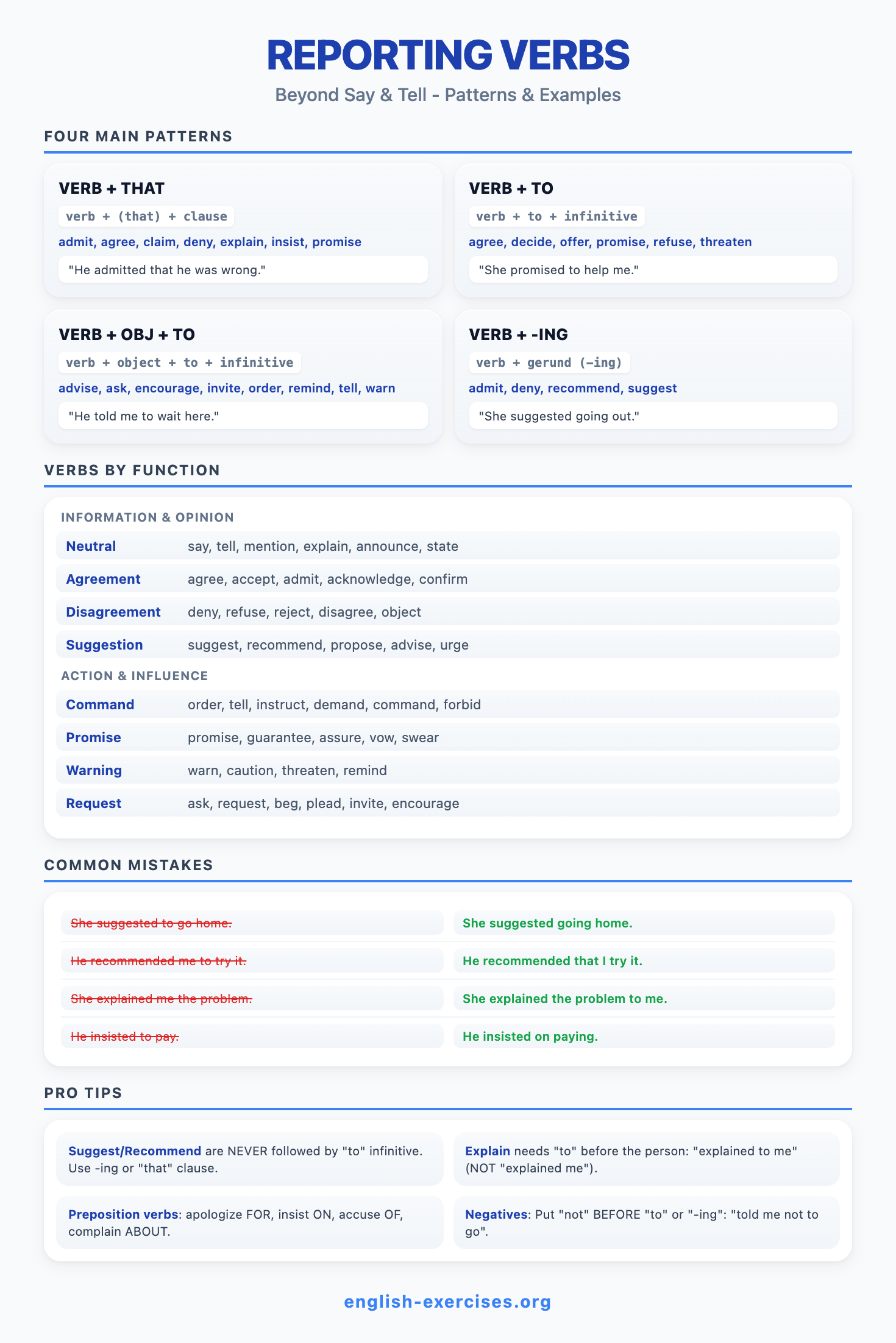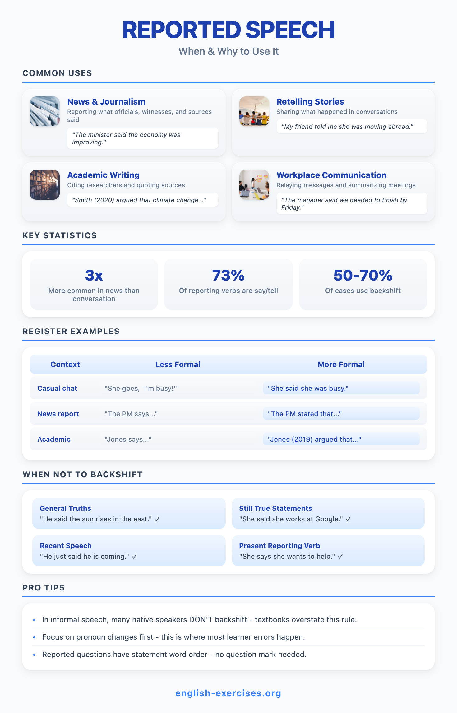 Reported speech (also called indirect speech) tells what someone said without using their exact words. Instead of quoting directly with quotation marks, you report the message in your own words. For example: Direct: "I am tired." Reported: She said she was tired. Corpus research shows reported speech occurs three times more often in news writing than in everyday conversation.