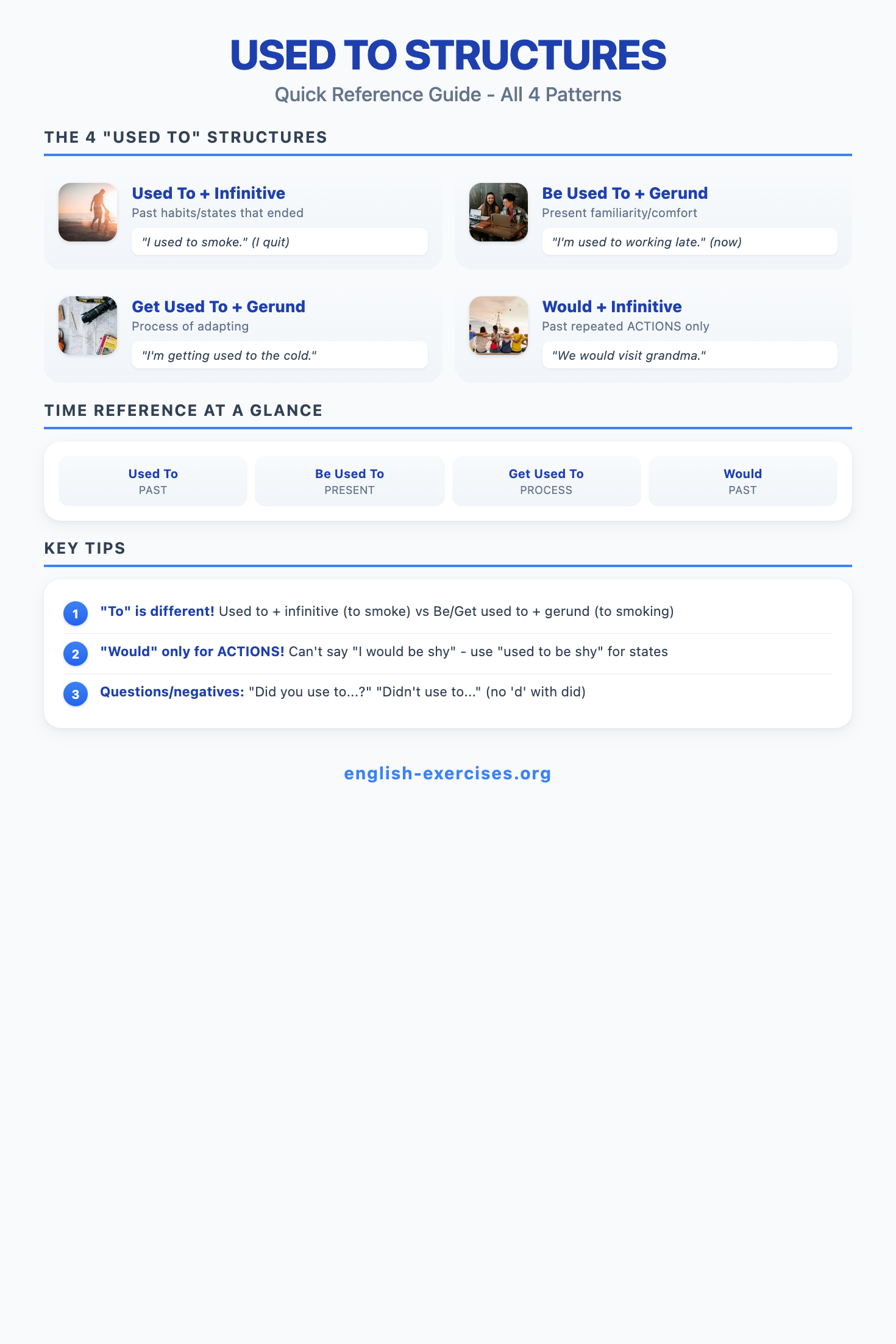 "Used to" and "be used to" are two completely different structures with different meanings and time references. According to the British National Corpus, "used to" for past habits appears approximately 85 times per million words, making it one of the most common ways to express past habits in English. The key difference is that "used to + infinitive" describes past habits that no longer exist, while "be used to + gerund" describes present familiarity or comfort with something.