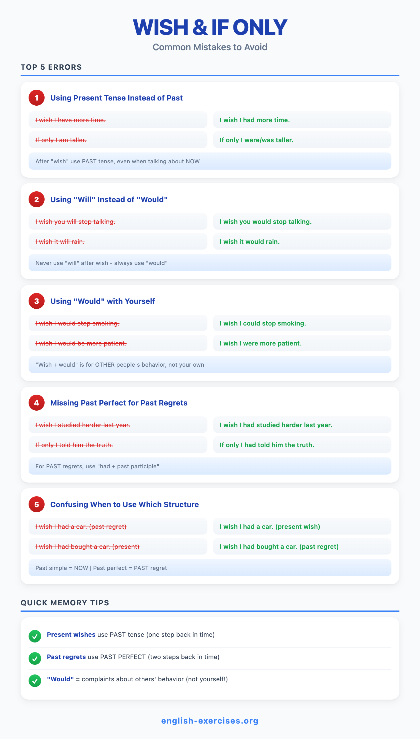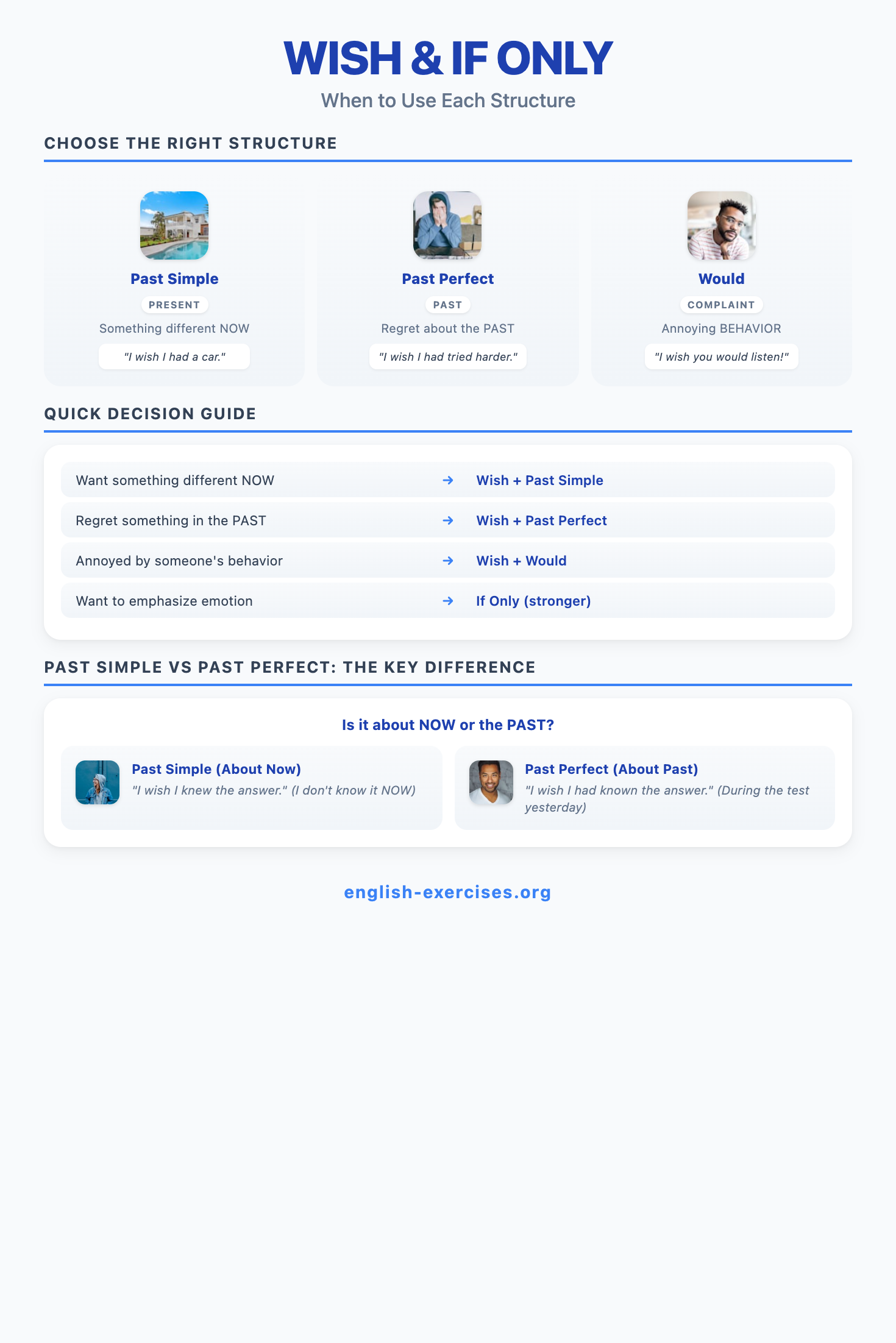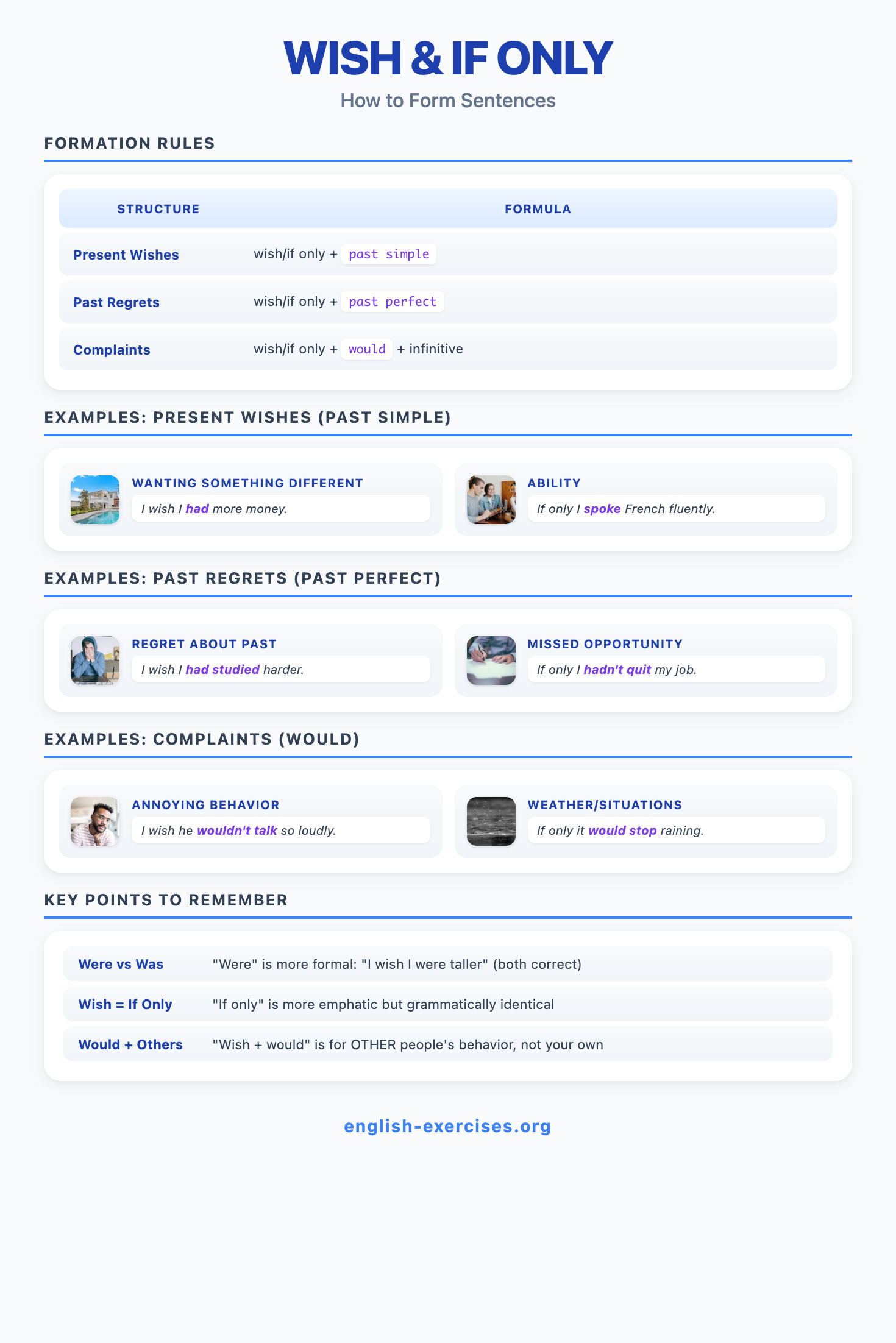 "Wish" and "if only" are used to express desires for situations to be different from reality. They show dissatisfaction with the present, regret about the past, or frustration with other people's behavior. "If only" is simply a more emphatic and emotional version of "wish".