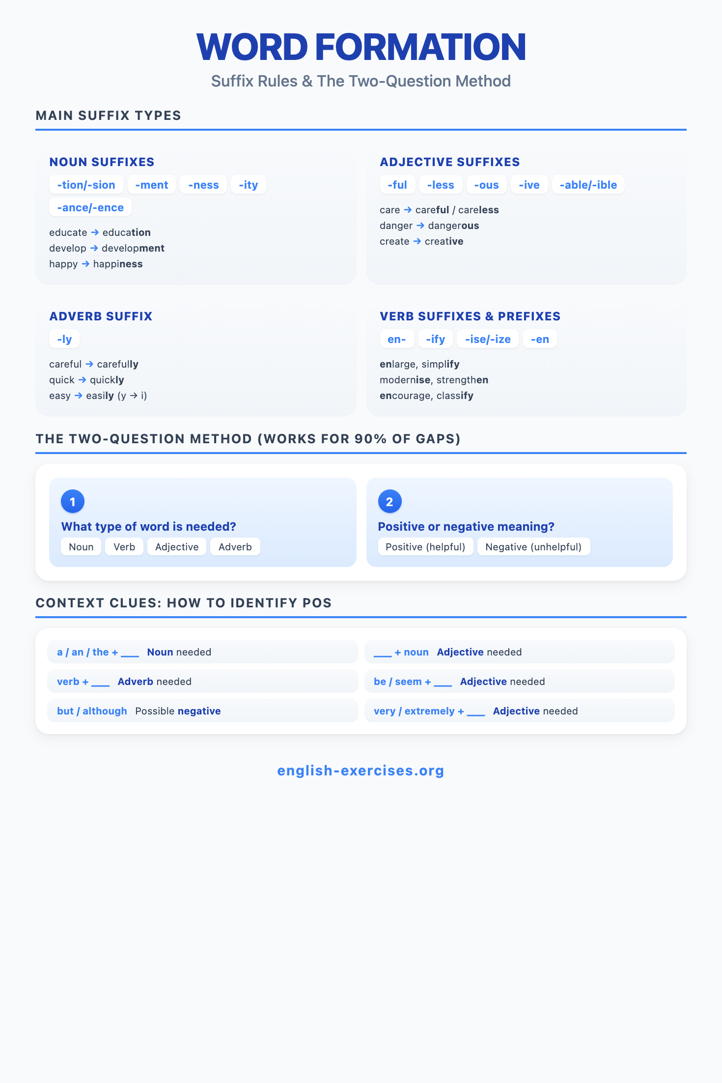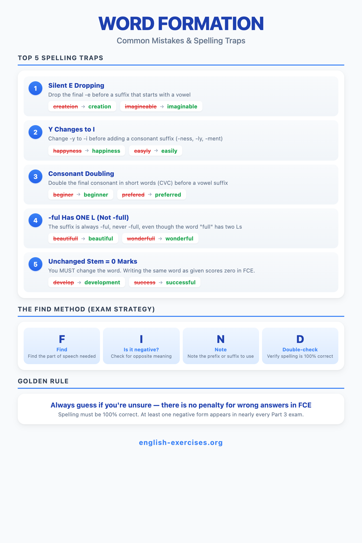 Word formation is the process of creating new words by adding prefixes or suffixes to a base word, or by making internal spelling changes. It is one of the most productive features of English vocabulary. Mastering word formation is essential for the Cambridge B2 First (FCE) exam, where Part 3 of Reading and Use of English tests your ability to transform a given word to fit a gap in context.