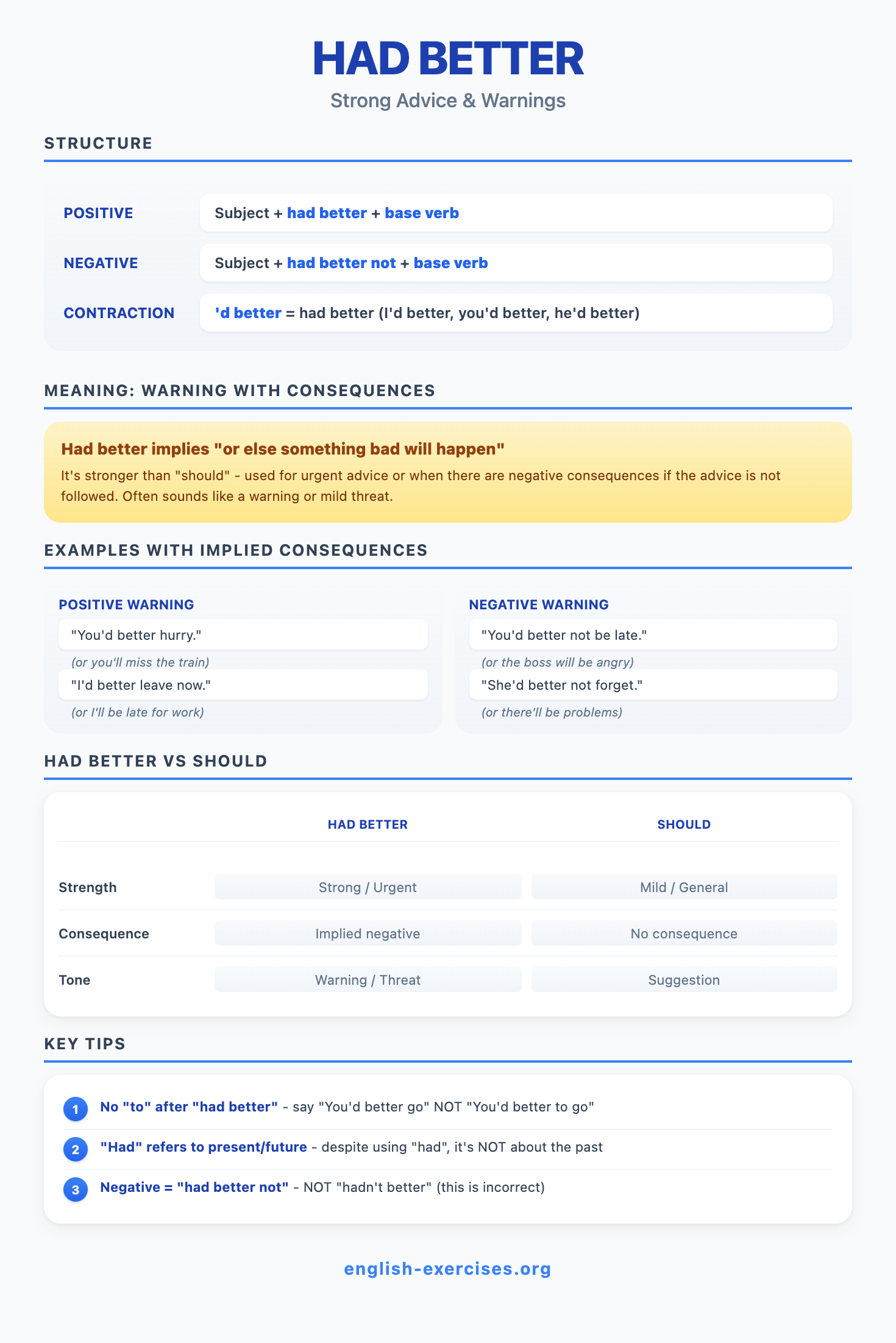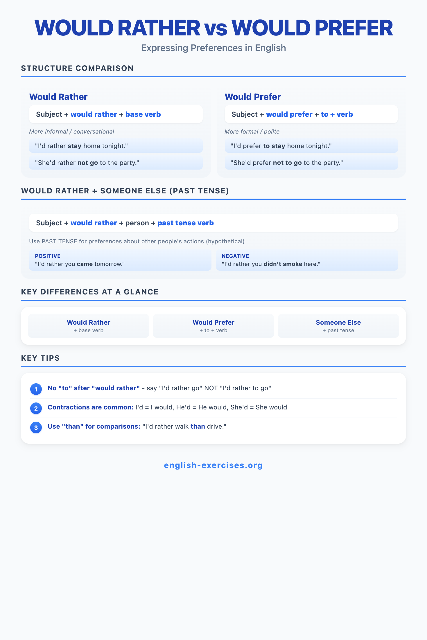 These three structures help you express preferences and give advice in English. "Would rather" and "would prefer" both express what you prefer, while "had better" gives strong advice or warnings. Corpus research shows these structures are extremely common in everyday conversation, particularly in decision-making situations.